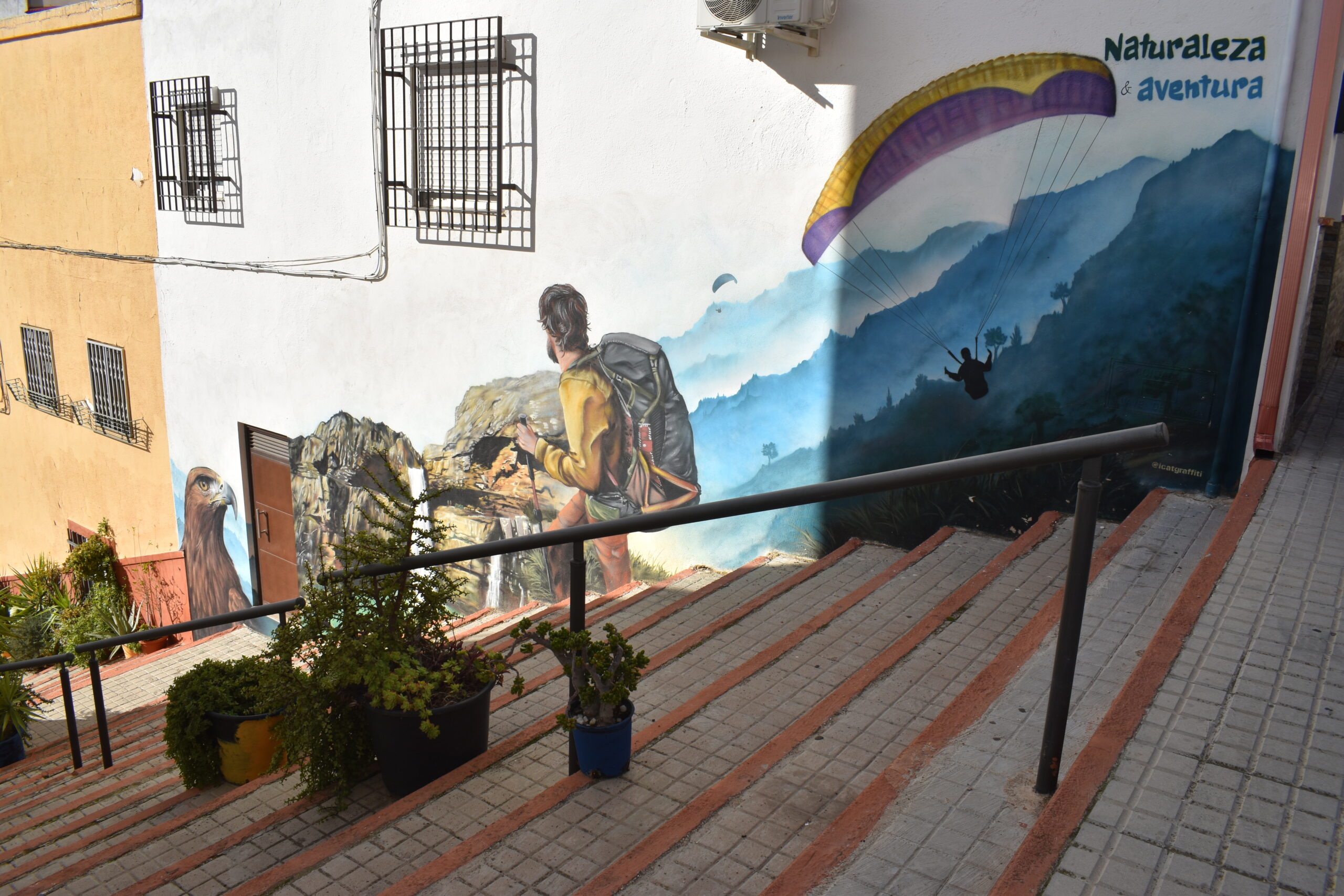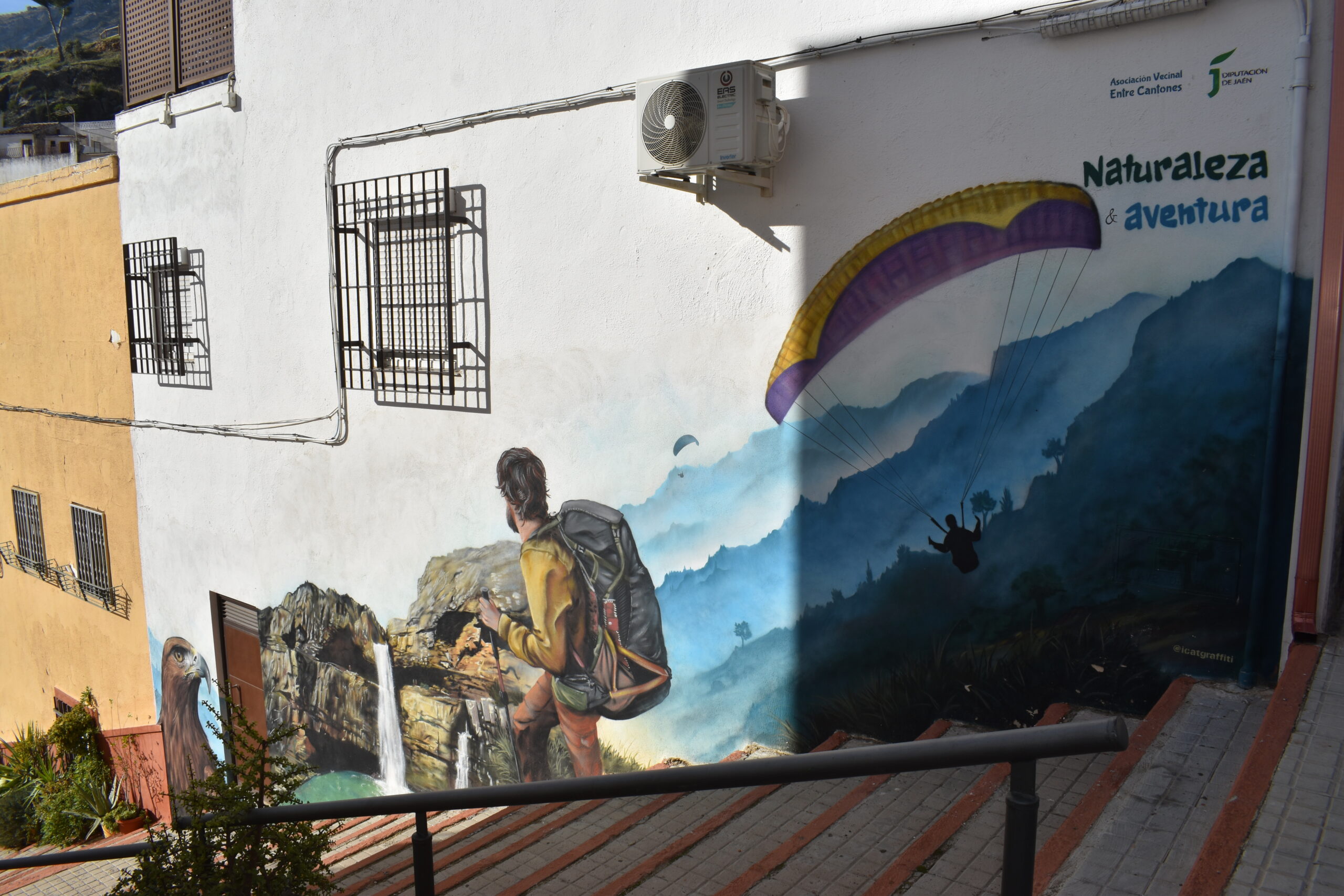Este mural representa la diversidad de parajes que encontramos en la provincia de Jaén. Desde senderismo hasta parapente, son muchas las actividades que nos acercan a la bella naturaleza jiennense, y que atrae cada vez a más aventureros.