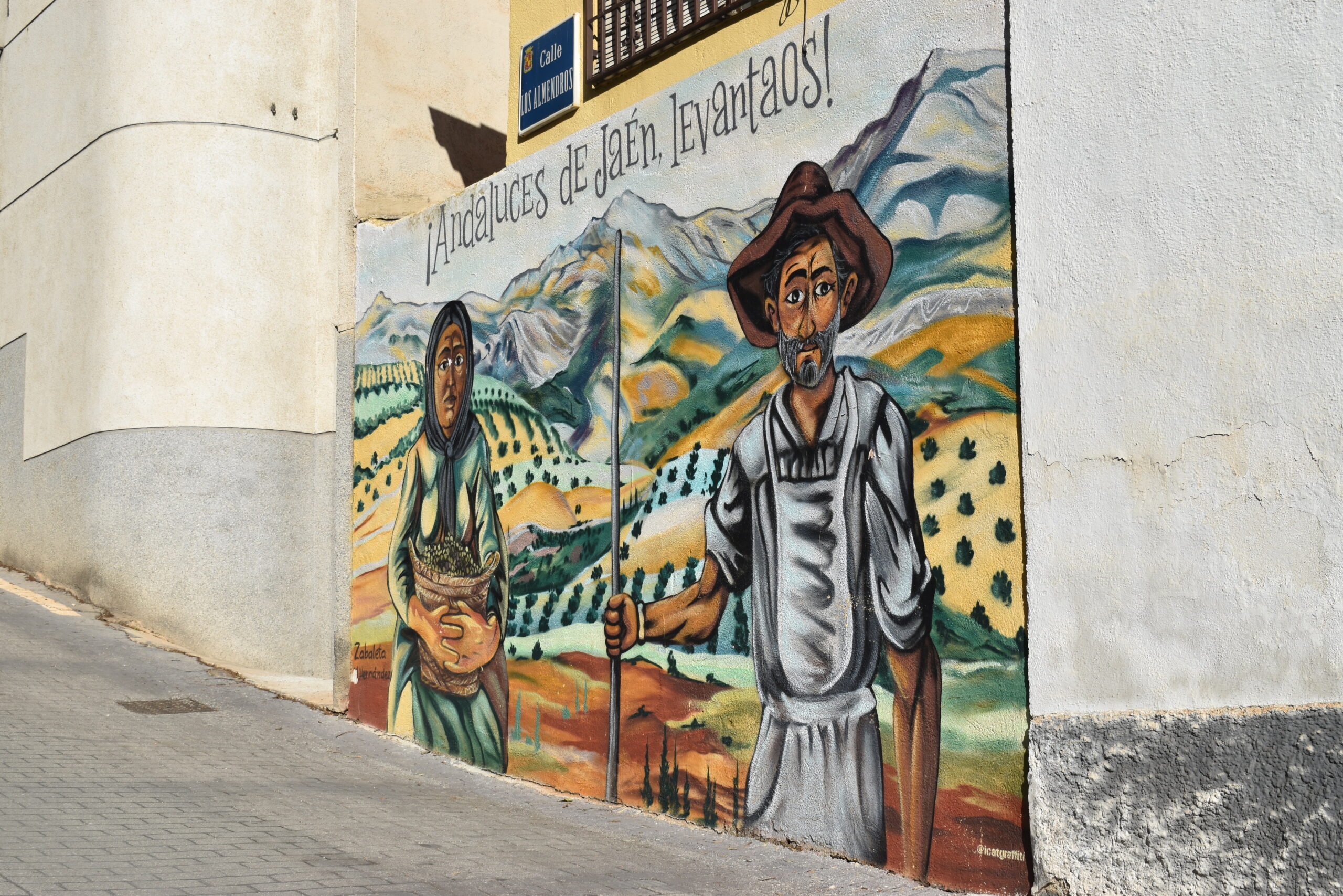 En la parte superior del mural, se lee la frase: «¡Andaluces de Jaén, Levantaos!» Esta es una referencia directa a un famoso poema de Miguel Hernández, «Andaluces de Jaén», que honra a los trabajadores del olivar.