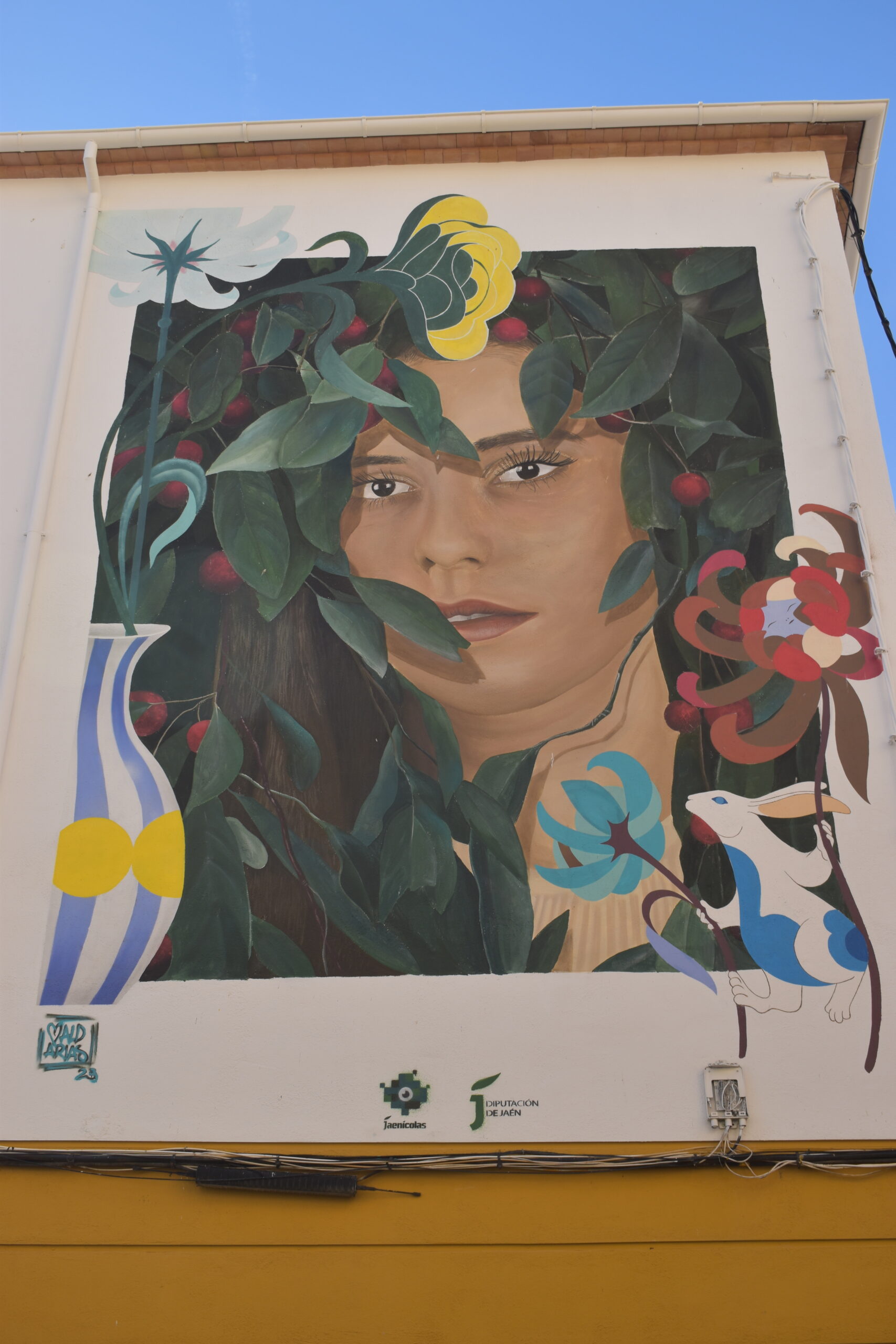 El mural representa un retrato de una mujer joven de mirada penetrante, enmarcada por un denso follaje verde y bayas rojas, como si estuviera asomándose entre la vegetación. El estilo del rostro es fotorrealista.
