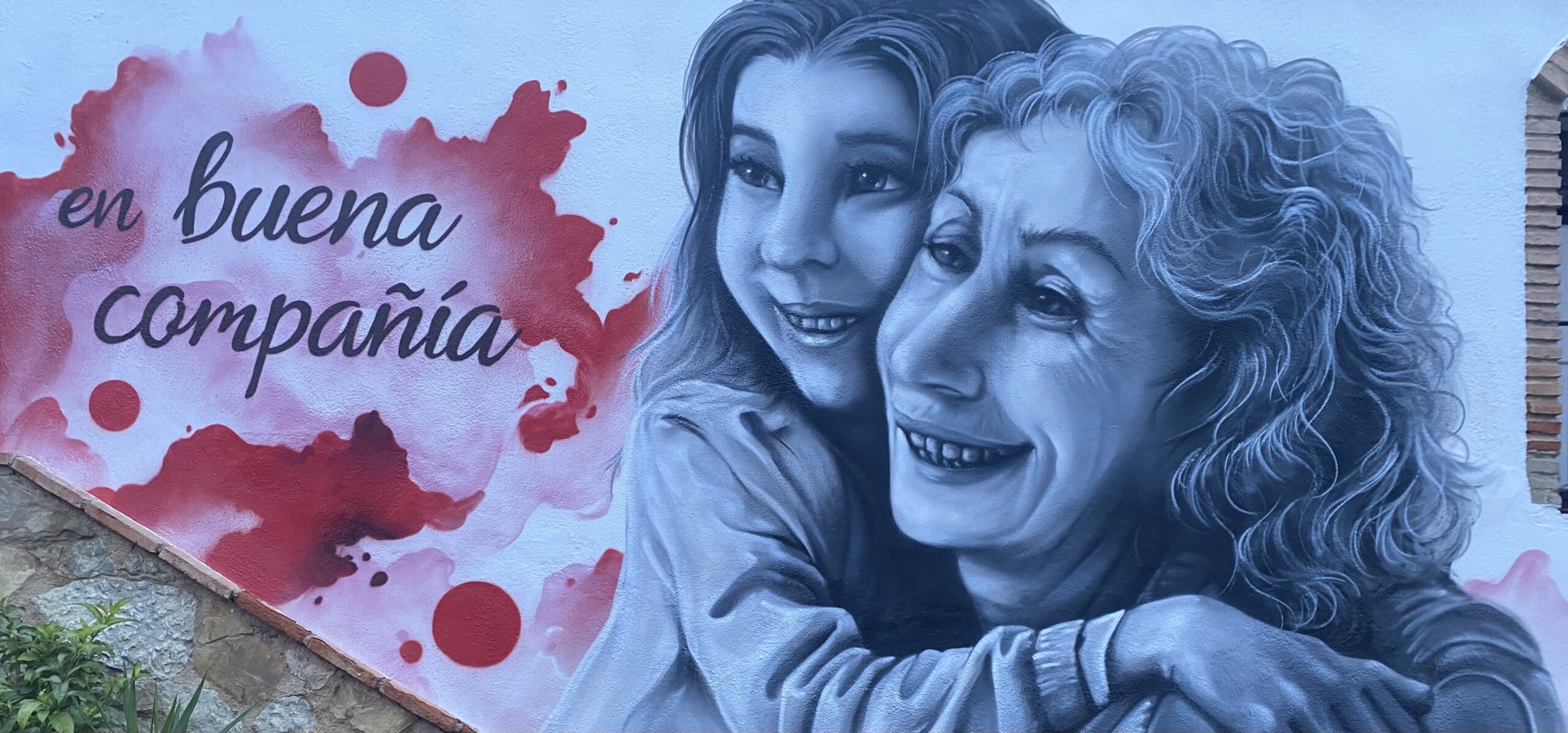 A la izquierda del mural, se lee la frase, pintada en una caligrafía fluida y en color marrón oscuro, que dice: «en buena compañía». El fondo detrás del texto es de un intenso rojo carmesí. Este color está aplicado con una técnica que simula manchas, salpicaduras o aguadas de acuarela, creando un efecto dinámico y artístico. Se aprecian círculos o puntos rojos más definidos que resaltan sobre las manchas.
