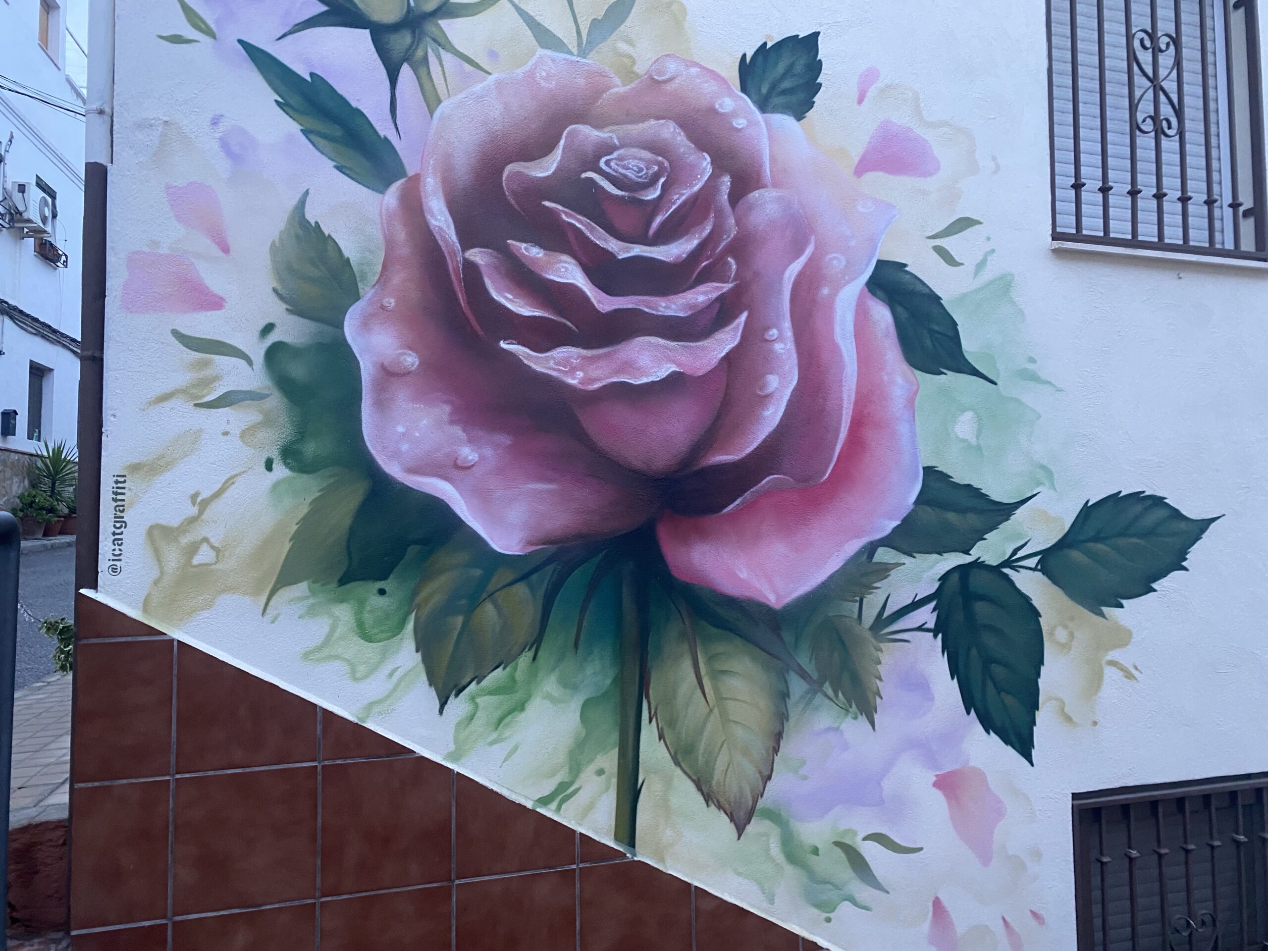 El mural está dominado por una única y gran rosa de color rosa viejo o malva con tonos más profundos hacia el centro.