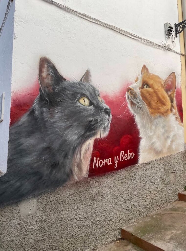 En el mural hay dos gatos en primer plano, pintados con una técnica realista que resalta la textura de su pelaje.
