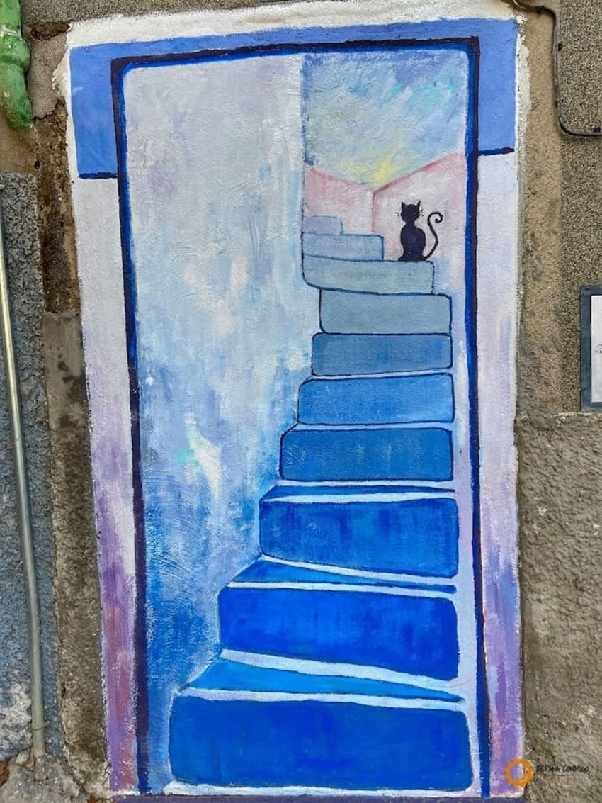 El mural muestra la imagen de unas escaleras en profundidad con un gato. Está hecha sobre una puerta tapiada, convirtiendo el triste abandono de casas en arte.